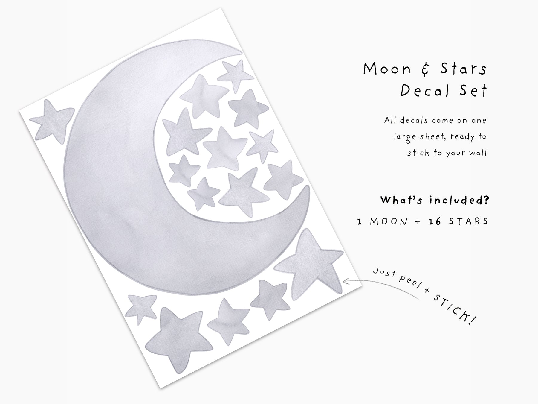 Make sure your little one is over the moon at bedtime! This simple watercolour moon and stars wall decal set is the perfect finishing touch to your little one's room; with it's modern picture book feel, it's a lovely addition to any nursery or bedroom