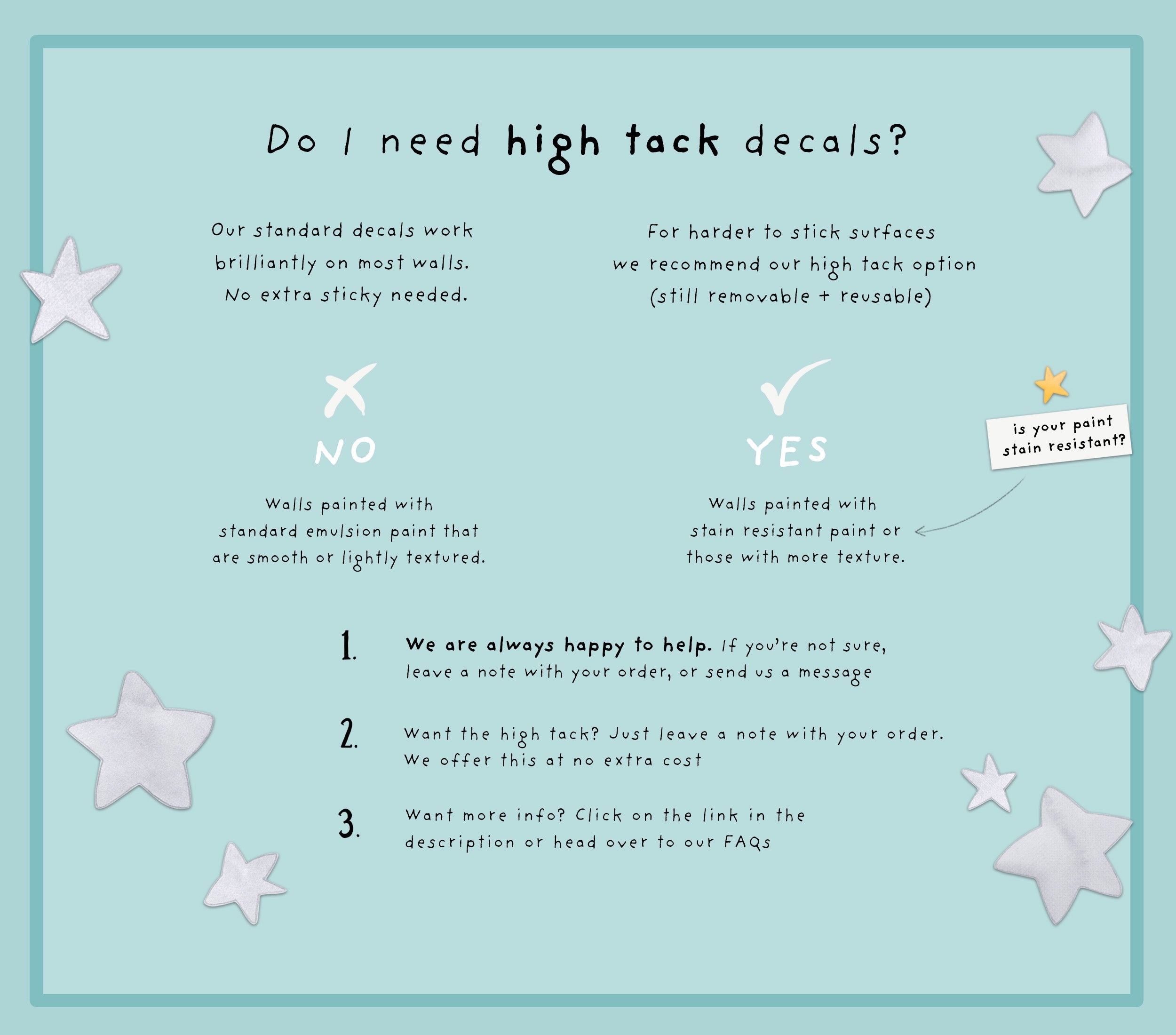 We do not believe that there is one strength of adhesive that can cater perfectly for everyone or every wall. Our standard decals are low tack and perfect for flat walls and standard paints. They are incredibly wall friendly and so easy to use. High tack is great for stain resistant paints, textured walls and public spaces